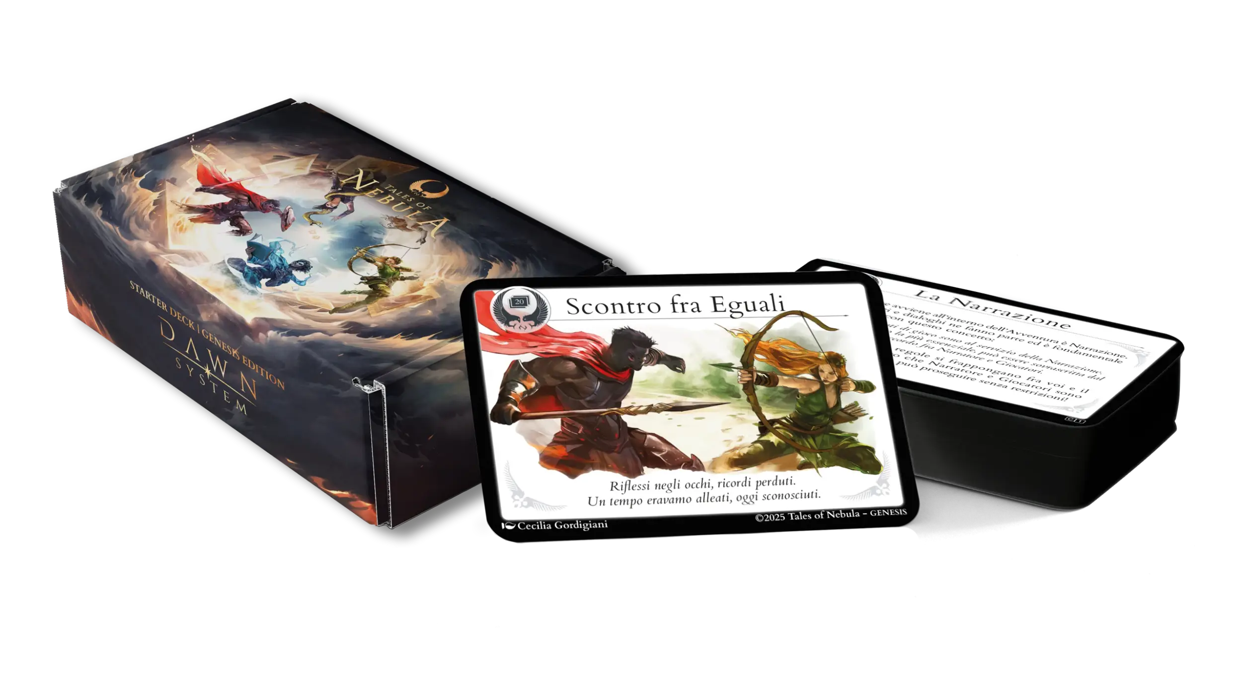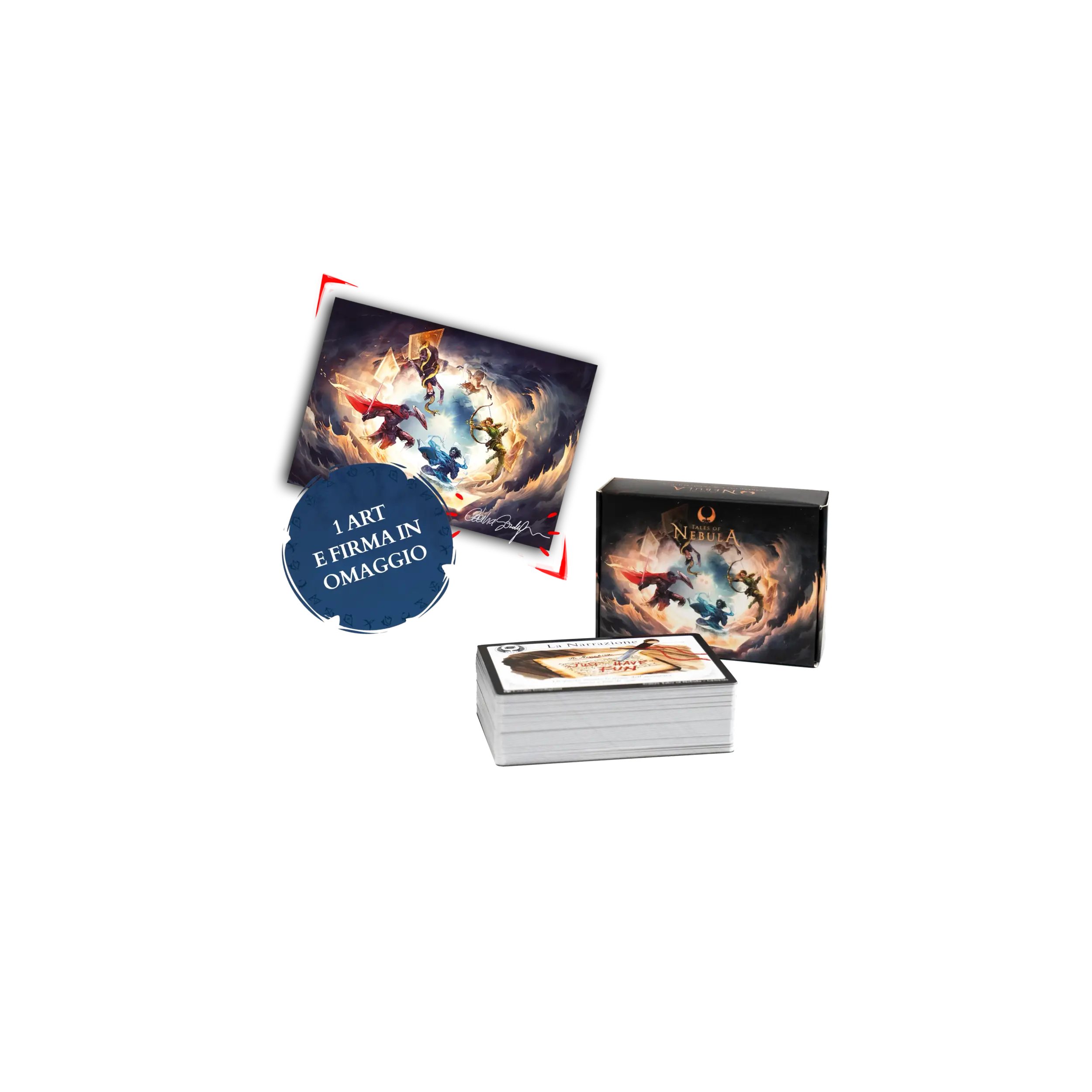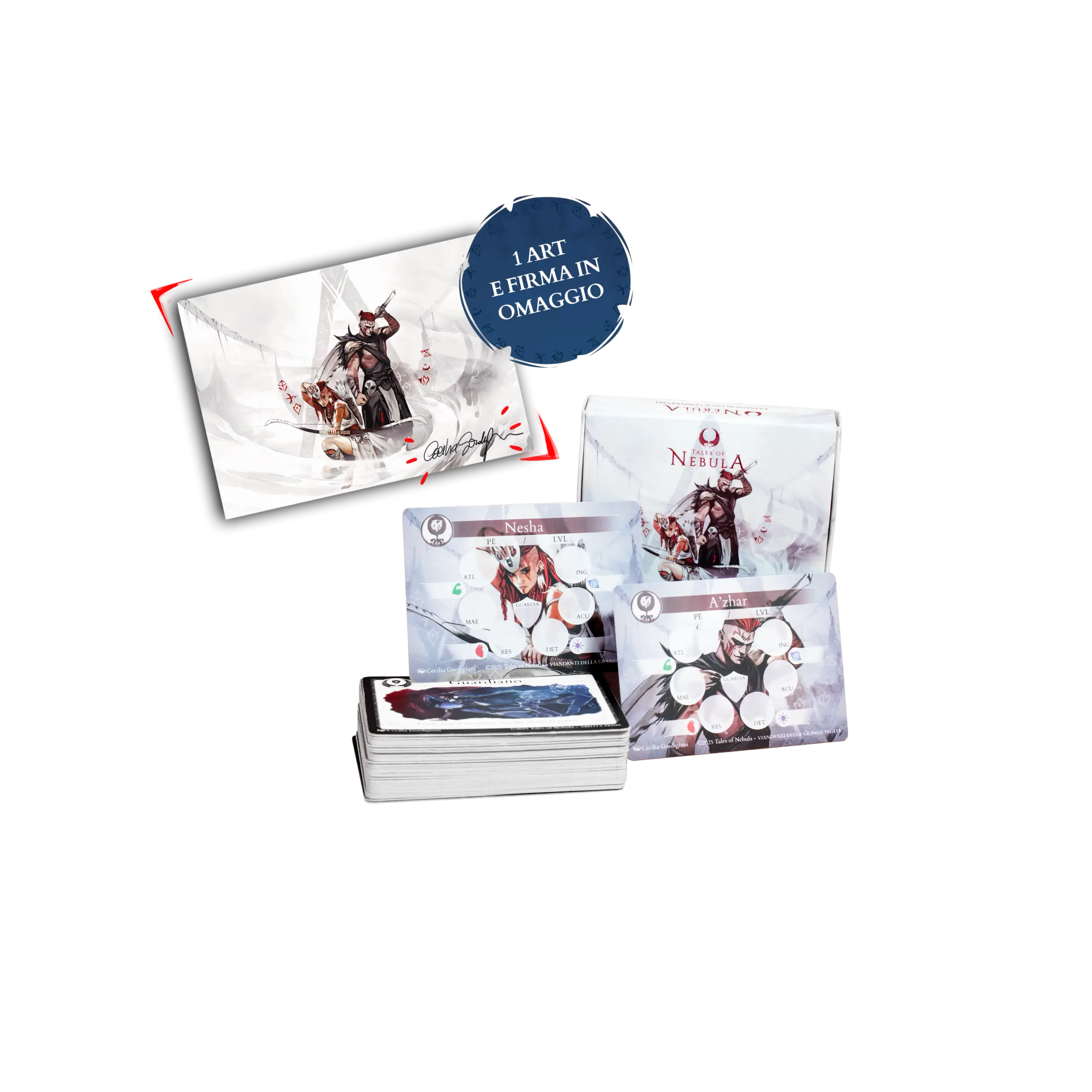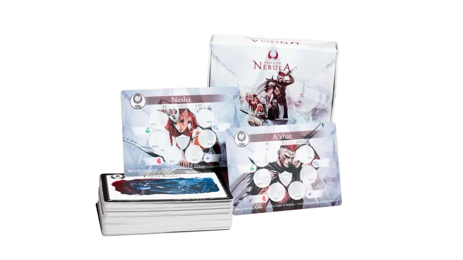 Lo stile inconfondibile di Tales of Nebula in un mazzo di carte illustrate. Inizia subito a giocare, anche senza manuale, con le 20 carte Essenziali e 6 Personaggi con abilità uniche, oppure personalizza le Carte Personaggio per dar vita a Personaggi unici.