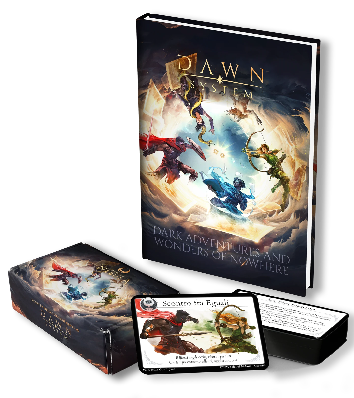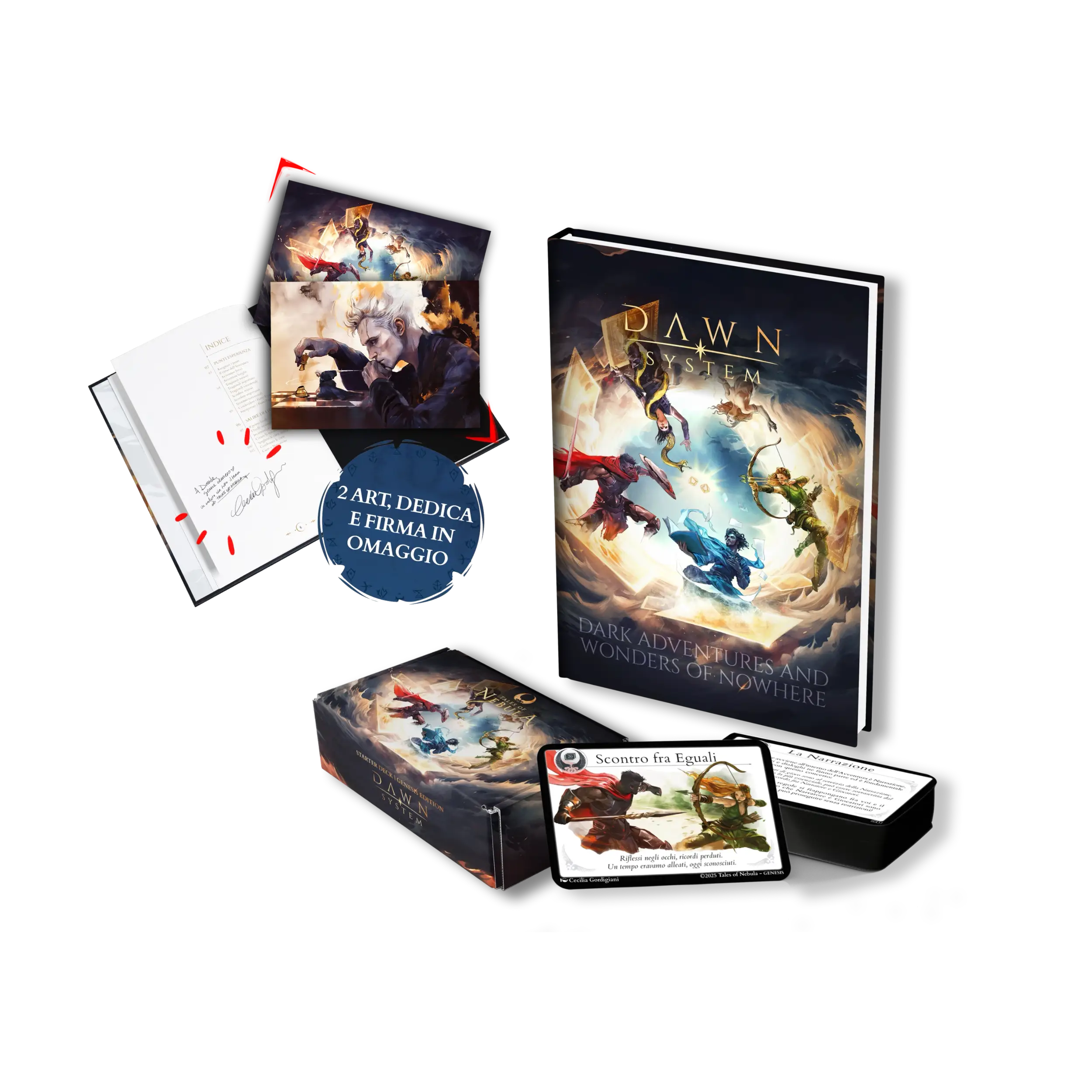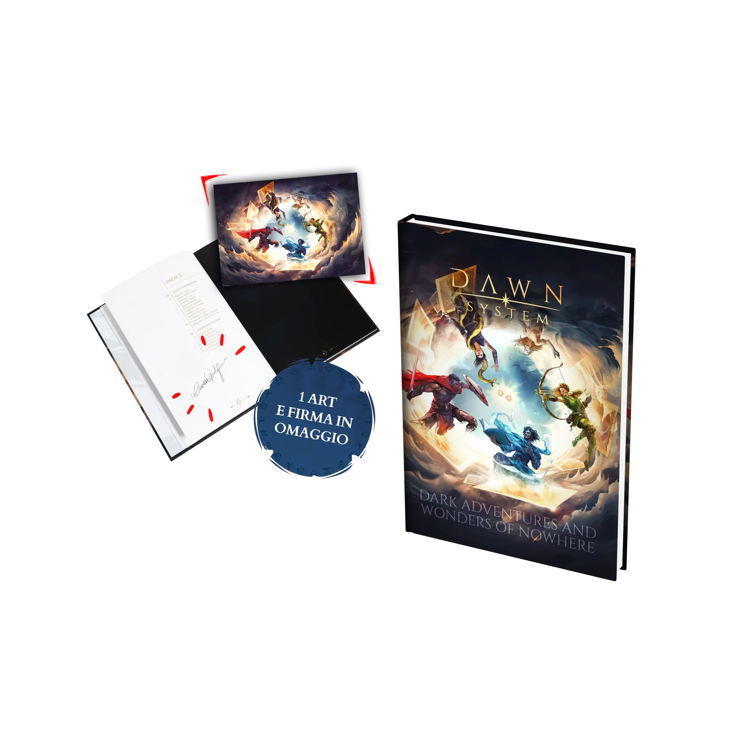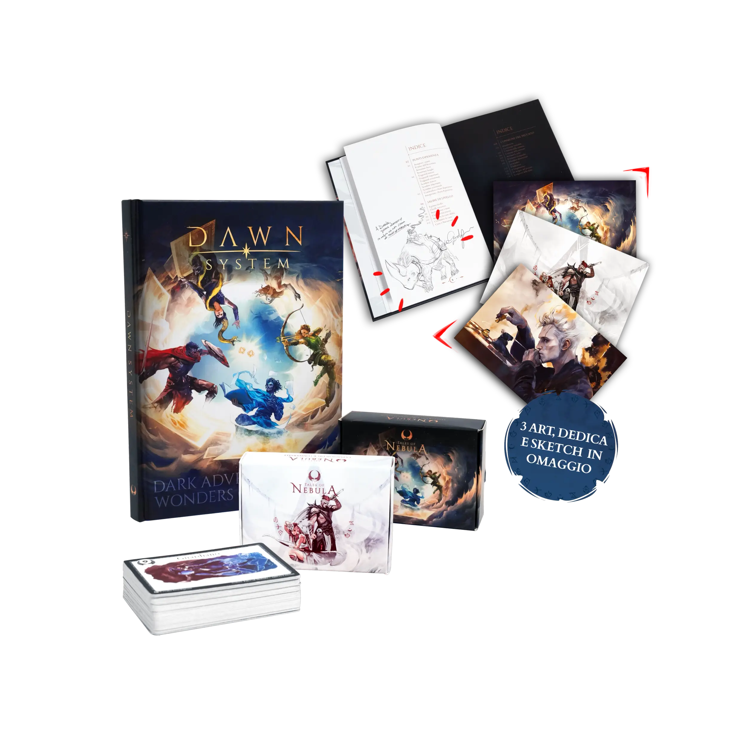 Molto più che un semplice vademecum, il DAWN System unisce i contenuti di un manuale, un artbook e due Avventure in un unico formato. Carta dopo carta, scoprirai il potenziale che si cela nelle 20 carte Essenziali e consigli utili per elevare il teatro della mente. Inizierai a giocare prima ancora di conoscere le regole!