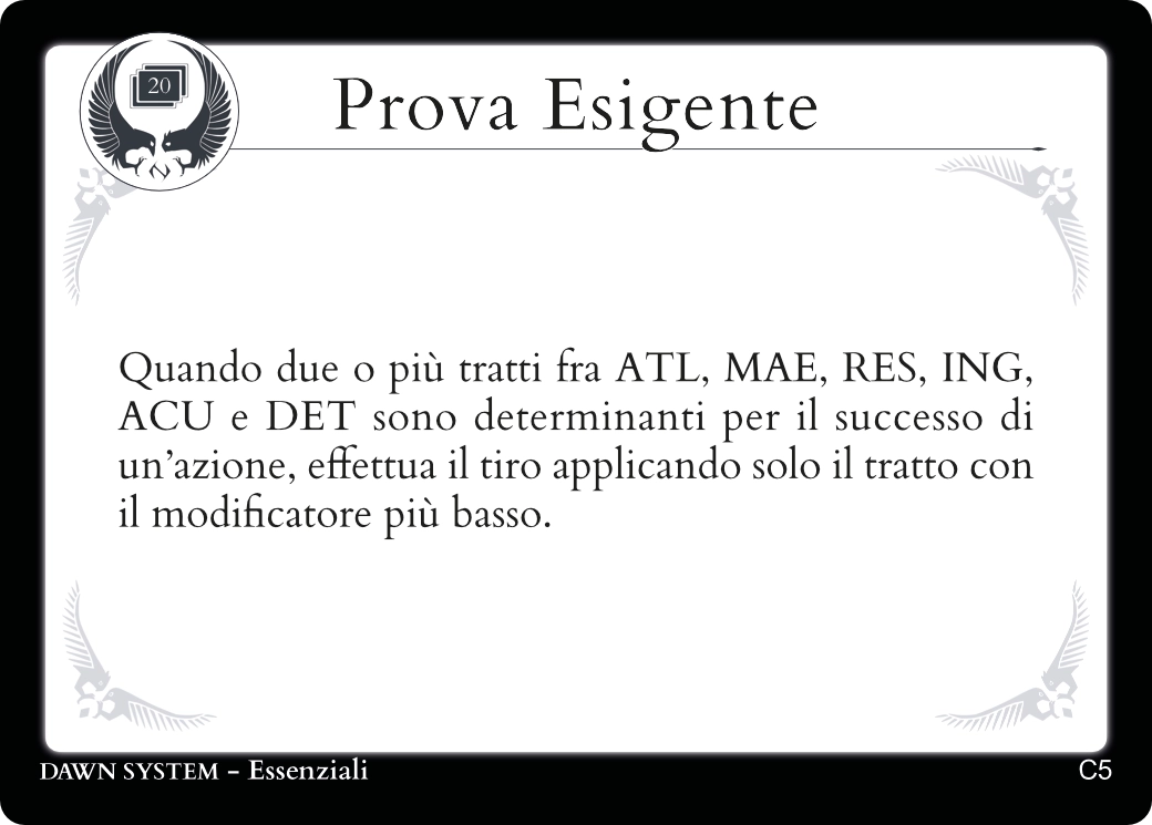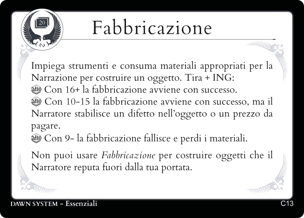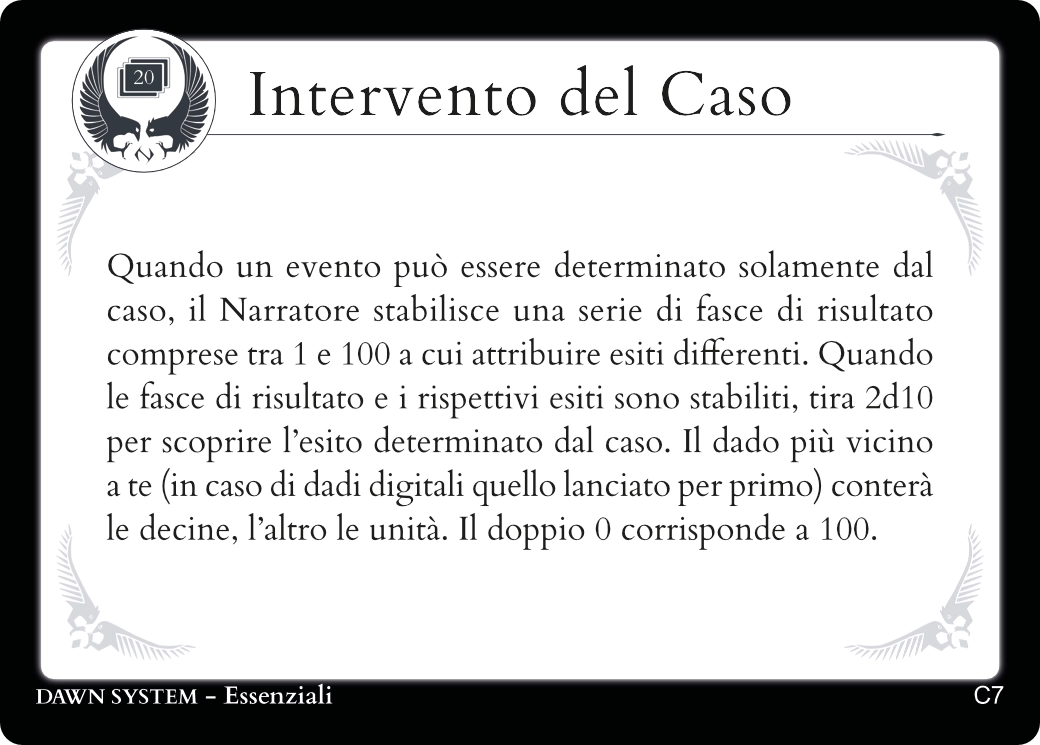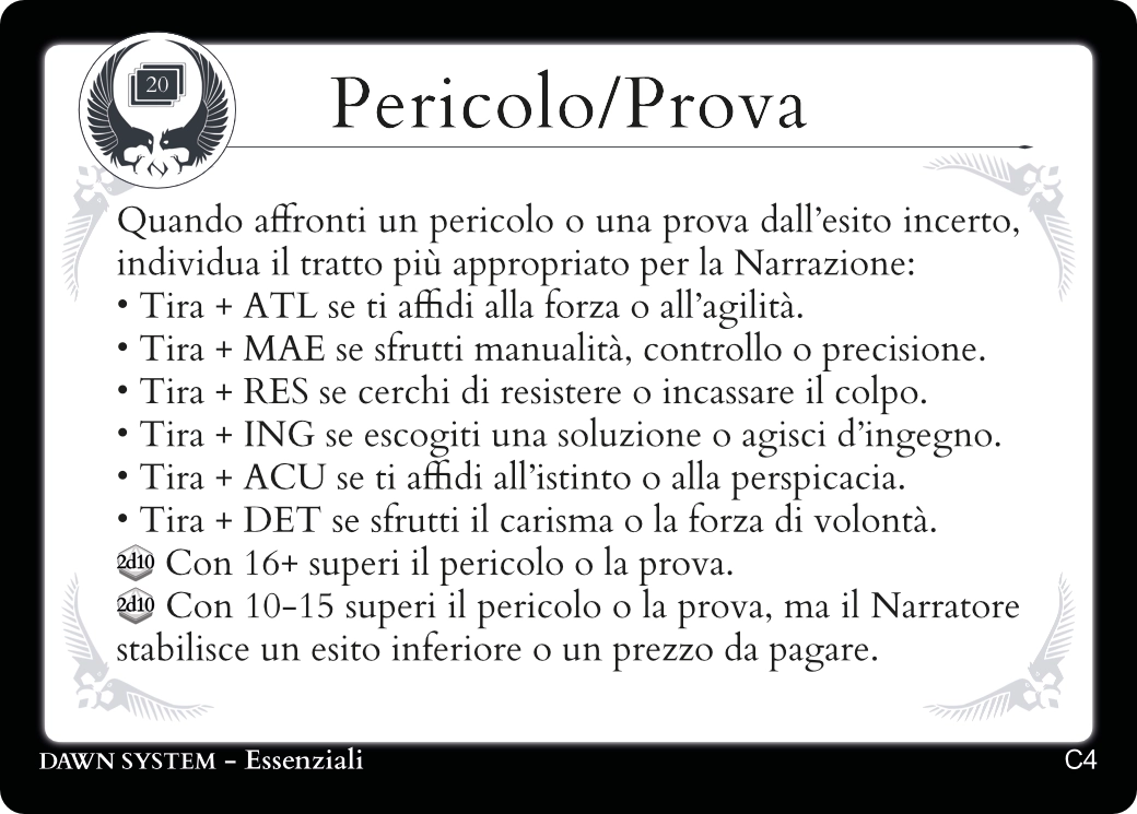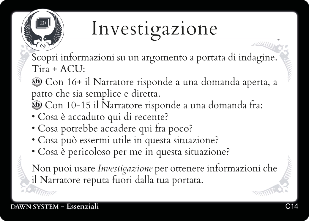 Descrivendo le azioni del tuo Personaggio troverai sempre una carta Essenziale adatta a regolamentarle.