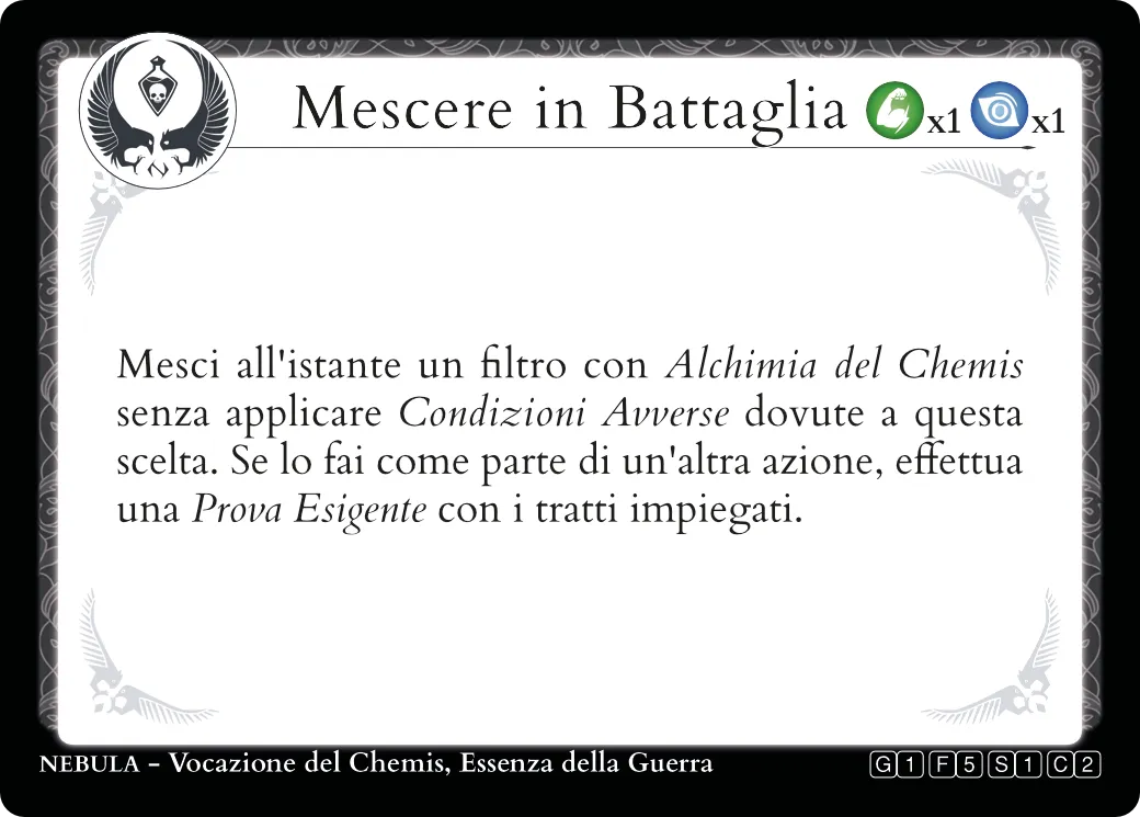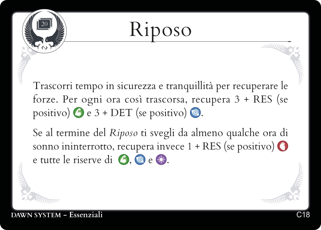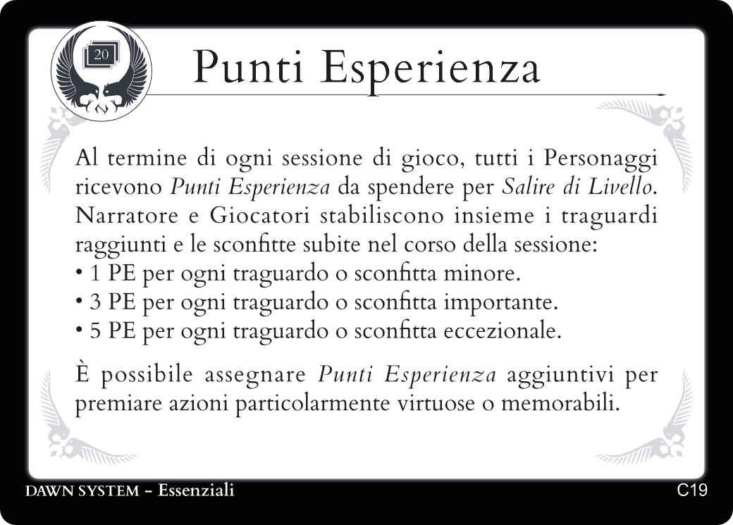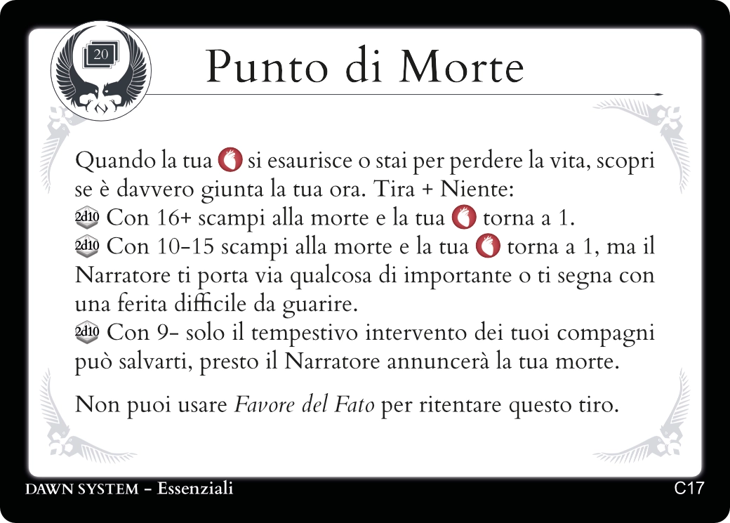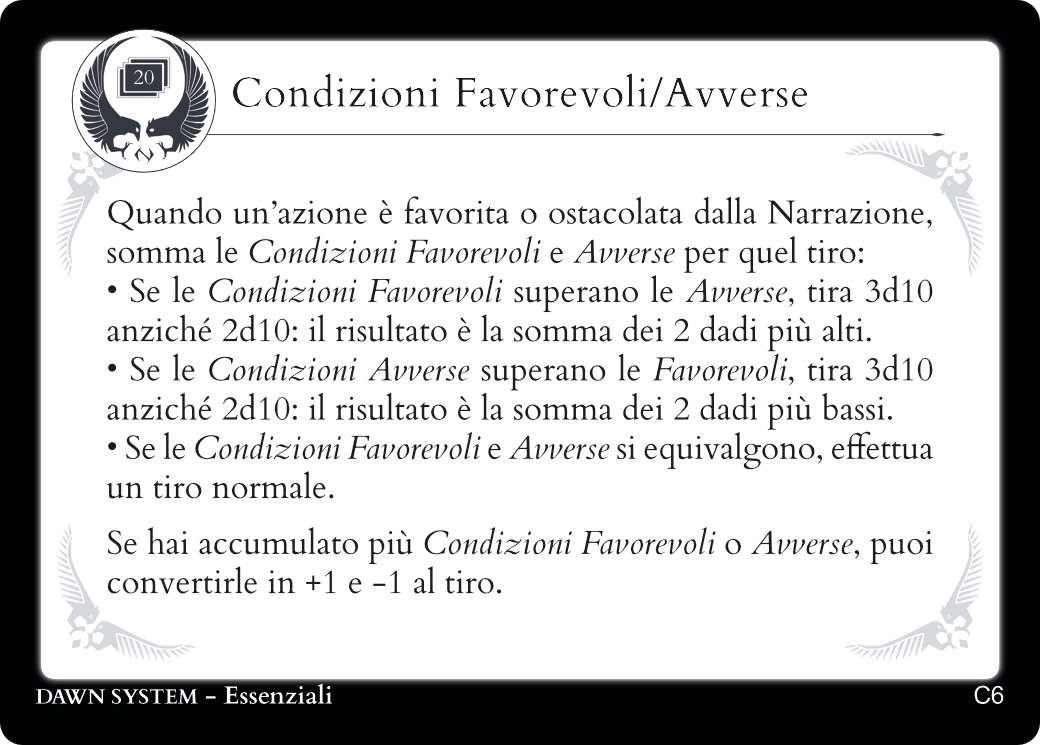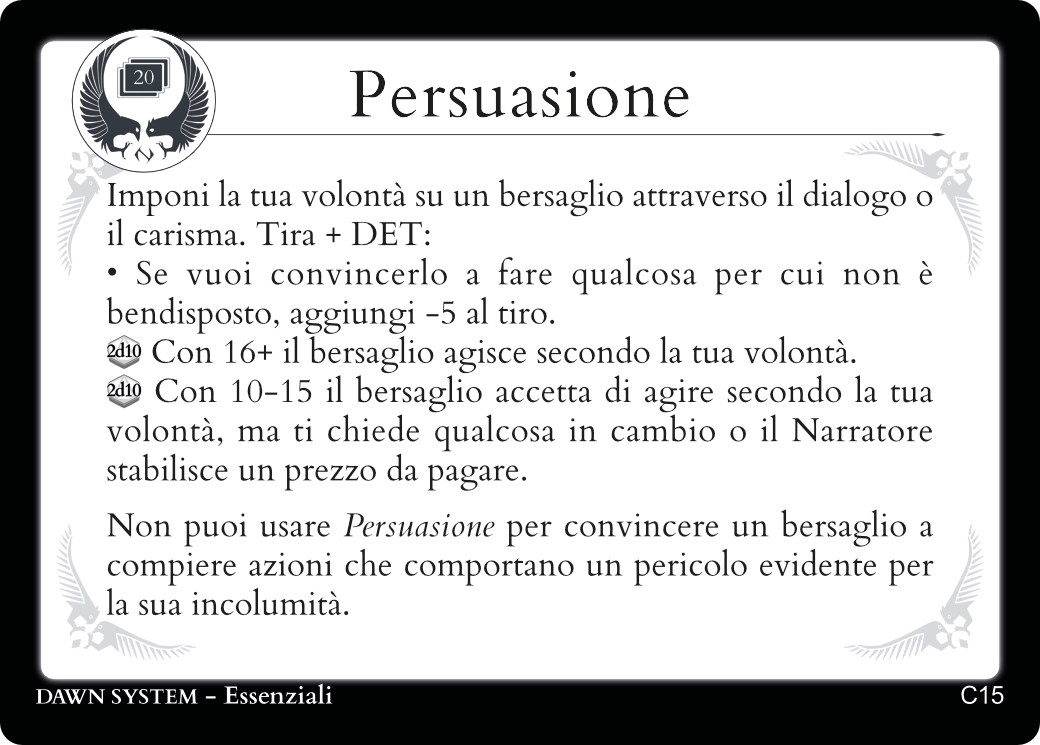 Descrivendo le azioni del tuo Personaggio troverai sempre una carta Essenziale adatta a regolamentarle.