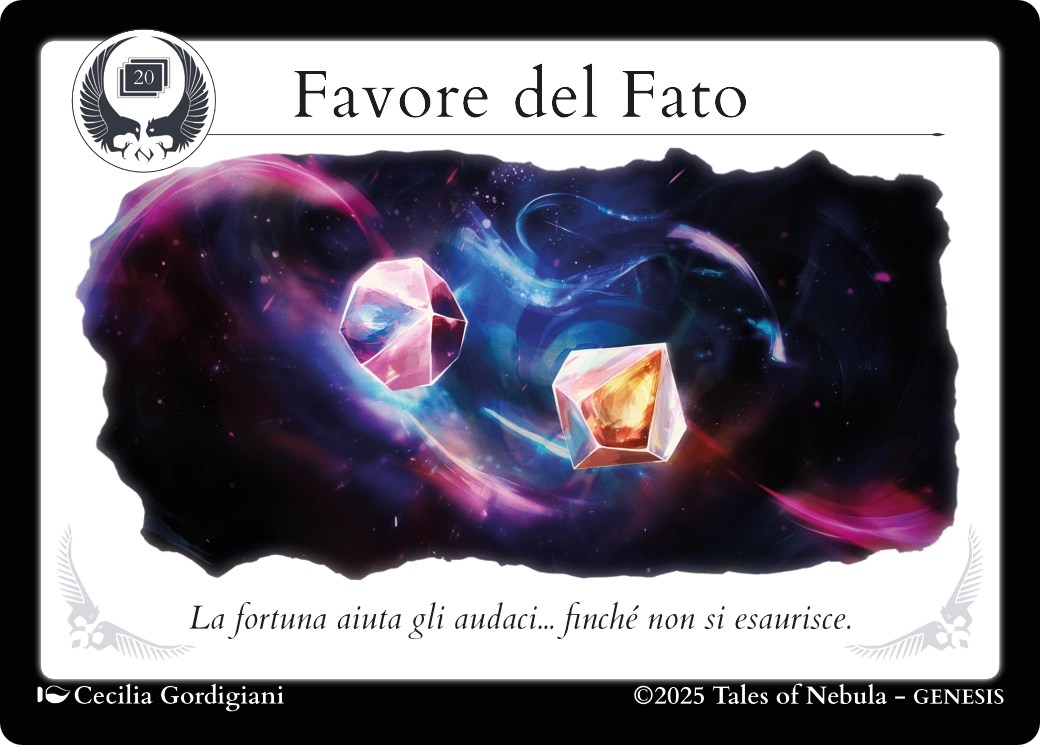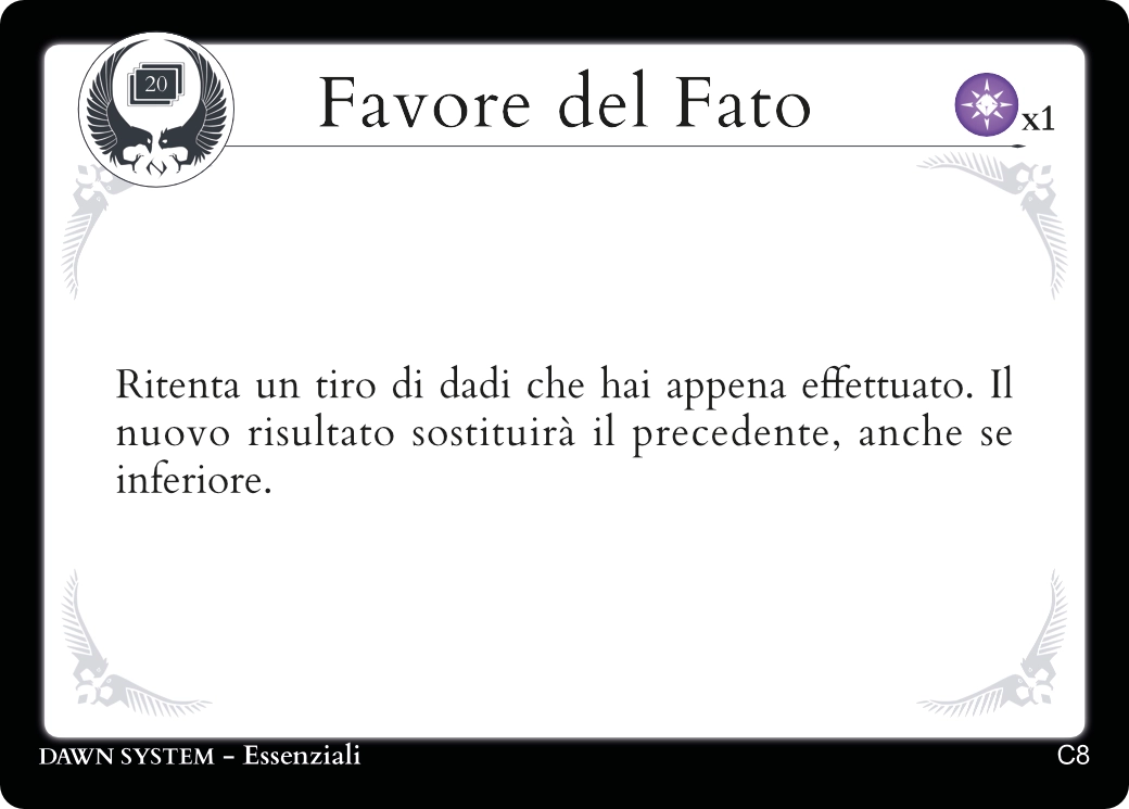 Questa carta può essere attivata dopo qualunque lancio dei dadi, a patto che appartenga allo stesso Personaggio che ne ha pagato il costo. In altre parole, non è possibile usare Favore del Fato per far ritentare il lancio dei dadi di qualcun’altro.
