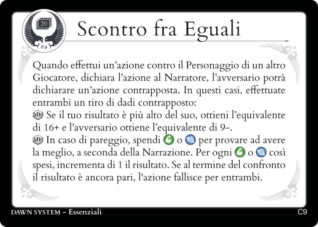 Quando due o più Personaggi decidono di affrontarsi, o semplicemente compiono un’azione che si contrappone alla volontà di altri, Scontro fra Eguali deciderà chi l’avrà vinta. Questo lancio dei dadi non prevede la possibilità di un successo parziale.