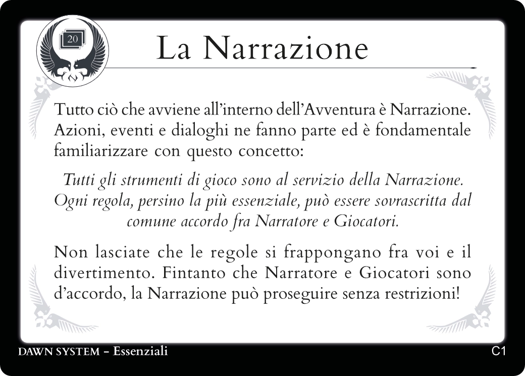 Al servizio della Narrazione, le 20 carte Essenziali contengono tutte le regole necessarie per giocare.