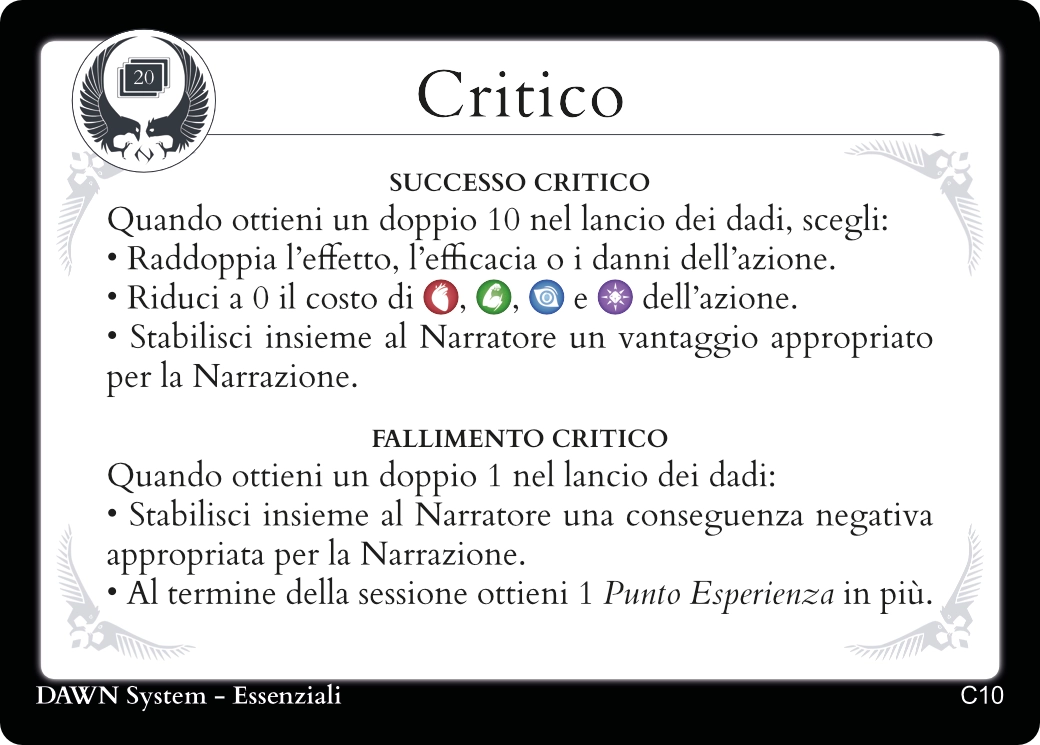 Il lancio critico è un evento estremamente raro che può elevare o condannare la Narrazione. Un successo critico permetterà ai Personaggi di superare ogni aspettativa. Il fallimento critico, d’altro canto, porterà con sé conseguenze devastanti.