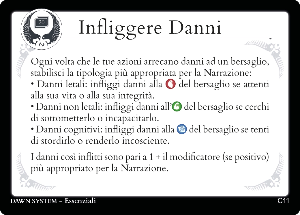 Che si tratti di un duello amichevole o di uno scontro all’ultimo sangue, per sconfiggere un avversario dovrai Infliggergli Danni. È la Narrazione a determinare che genere di danni infliggerai, i Tratti Fisici e Mentali determineranno invece l’efficacia delle tue azioni offensive.