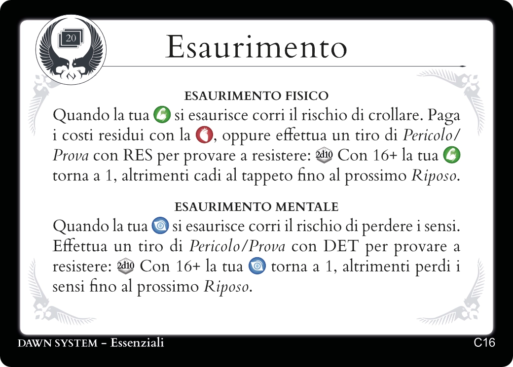 L’Energia rappresenta la resistenza agli sforzi fisici. Avrai bisogno di questa risorsa per chiamare in gioco alcune abilità, in particolare quelle atletiche e combattive, oppure per pagare il prezzo di alcune azioni dall’esito incerto. Quando l’Energia arriva a 0, il tuo Personaggio rischierà di crollare sotto gli effetti di Esaurimento.