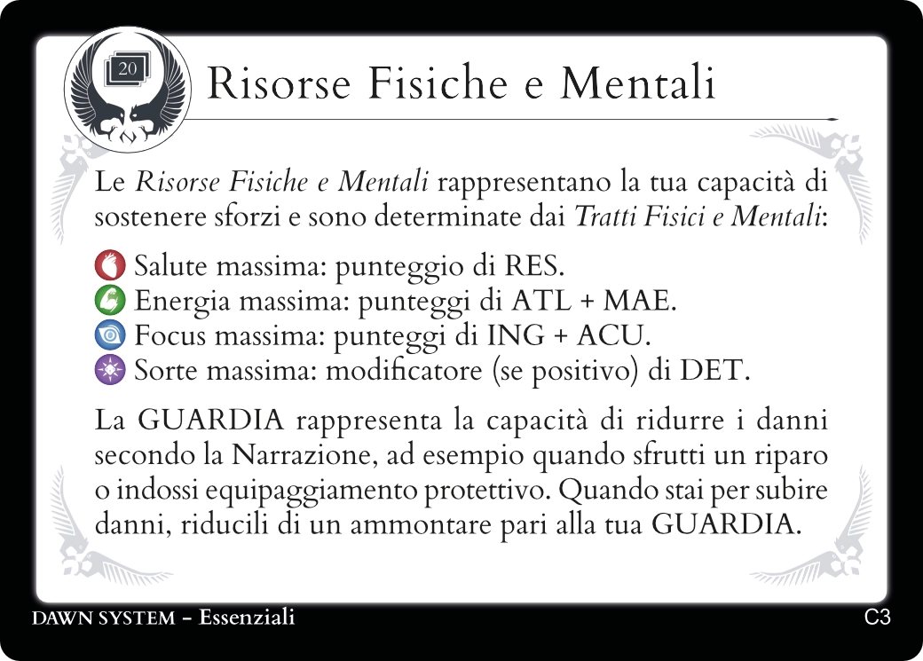 Usa i Tratti Fisici e Mentali per calcolare e segnare le tue Risorse Fisiche e Mentali negli spazi dedicati sulla Carta Personaggio.