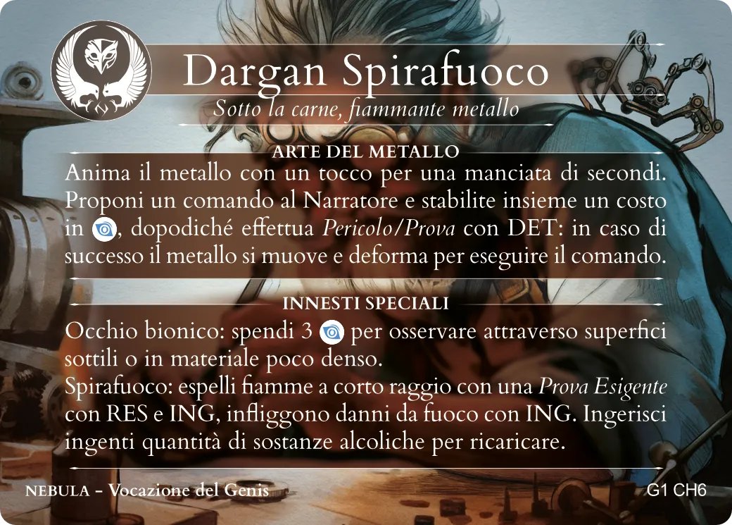 Questo punteggio rappresenta l'attitudine alla macchinazione e alla fabbricazione. Un Personaggio con un buon punteggio di Ingegno saprà fabbricare oggetti e strumenti di ogni sorta, armeggiare con macchinari e marchingegni complicati e fare buon uso dell'intelletto.