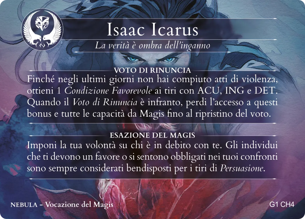 La Focus rappresenta la resistenza agli sforzi mentali. Avrai bisogno di questa risorsa per chiamare in gioco alcune abilità, in particolare quelle investigative, intellettuali o magiche, oppure per pagare il prezzo di alcune azioni dall’esito incerto. Quando la Focus arriva a 0, il tuo Personaggio rischierà di perdere i sensi sotto gli effetti di Esaurimento.