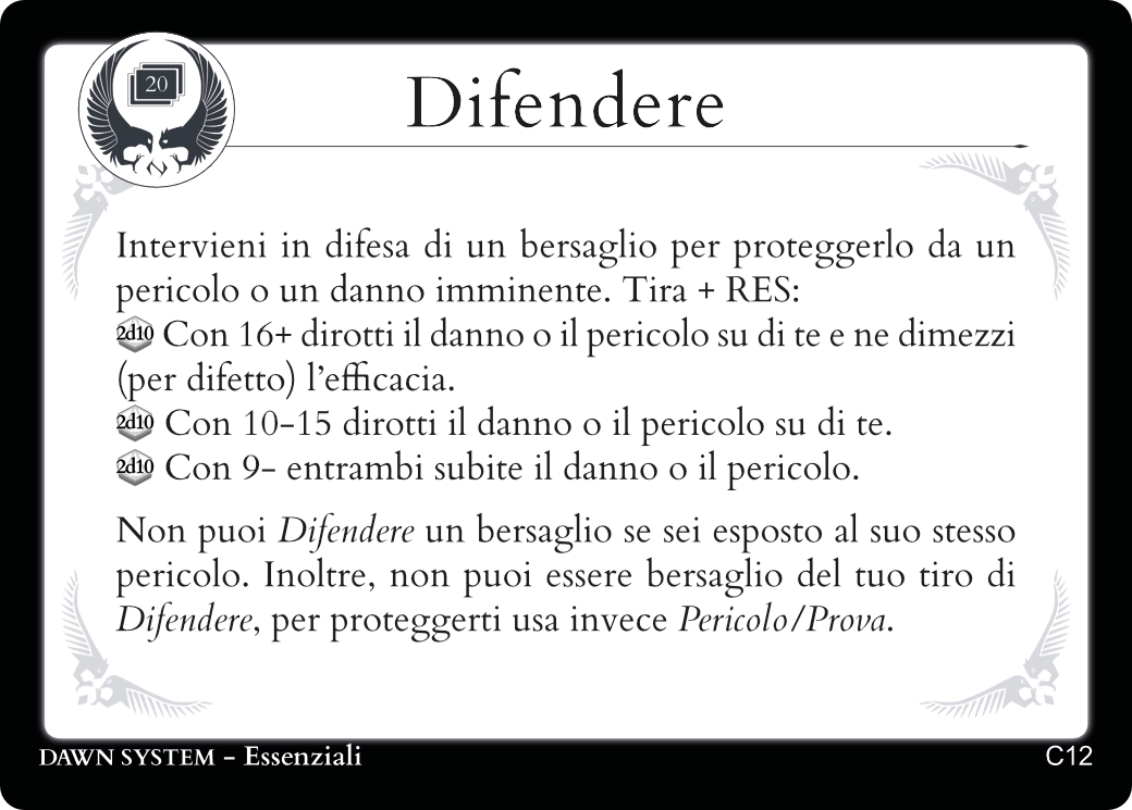 Di norma, è consentito scegliere sé stessi come bersaglio di un’abilità, ma non in questo caso. Se nella Narrazione viene descritta un’azione mirata a intercettare un pericolo a cui si è già soggetti, è opportuno chiamare in gioco la carta Pericolo/Prova piuttosto che Difendere. Questo non significa che non potrai aiutare altri Personaggi in difficoltà, ma solamente che per farlo devi prima essere fuori pericolo. In altre parole: solo i Personaggi che non corrono alcun pericolo o che hanno superato con successo il pericolo, possono Difendere altri Personaggi soggetti a quello stesso pericolo.